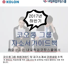 코오롱 그룹 자기소개서,면접준비 어떻게?? 안녕하세요. 코오롱 그룹 자기소개서,면접준비 어떻게?라는 주제로 코오롱 그룹 자기소개서 준비하는 방법 알려 드리려고 합니다. - 지원자격 - 1. 대학교 4년제 정규대학 졸업자 2. 관련경력 및 자격증 3. 병역의 경우, 남성의 경우 군필 또는 면제자 - 서류접수기간 - 2017.12.16 ~ 12.31 - 채용분야 - 화장품 해외영업, 전략기획, 인사, 회계, FS수주, FM수주 등 - 제출서류 - 주민등록등본, 취업보호 대상증명원, 어학성적표, 경력증명서, 자격증사본, 최종학교 졸업증명서, 학부 졸업증명서, 학부 성적증명서 ! 서류전형 > 1차면접 > 2차면접 > 건강검진 > 최종합격 순으로 진행 됩니다. 자기소개서 면접은 내일취업코칭스쿨에서 1:1스피치, ..